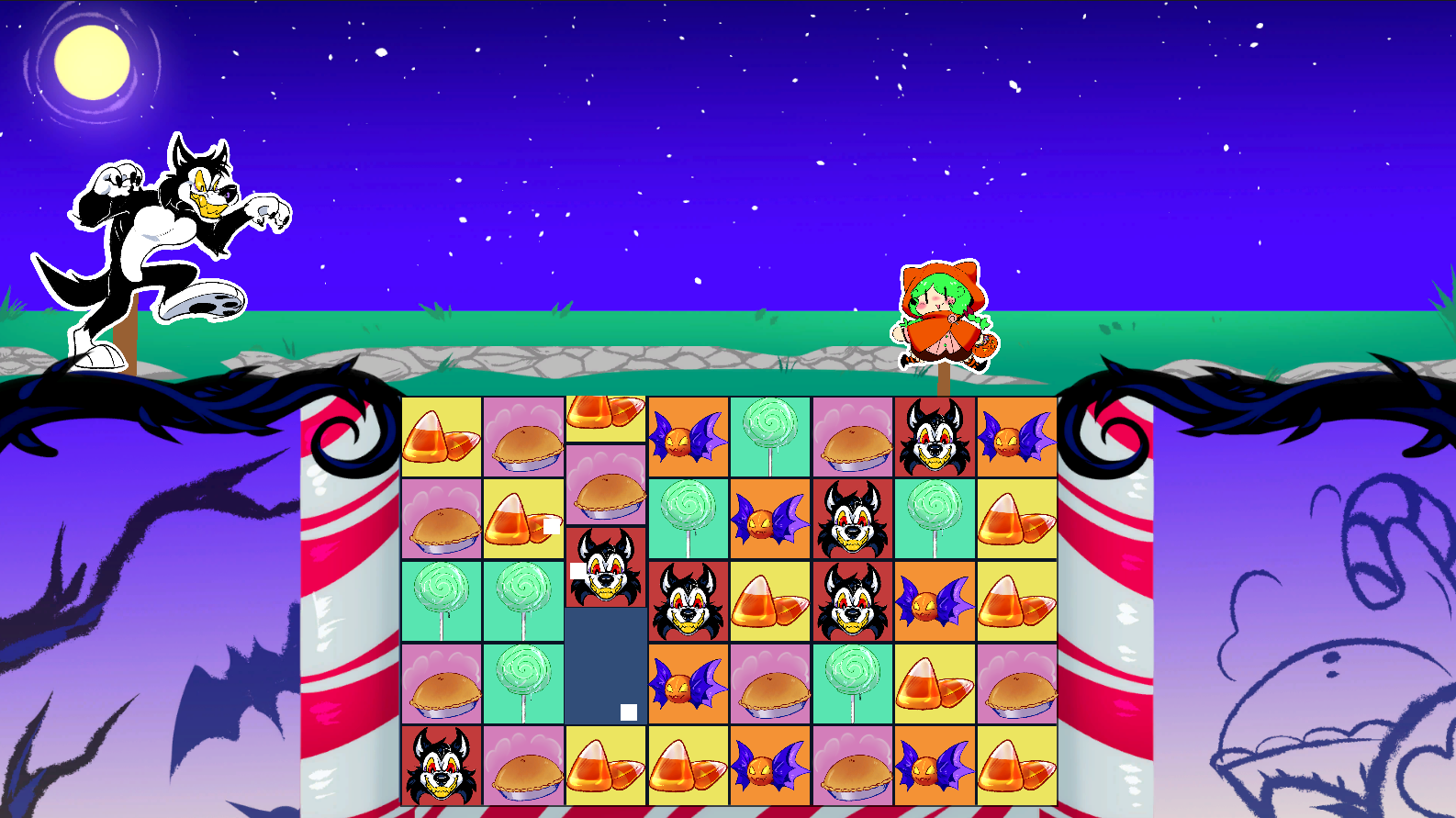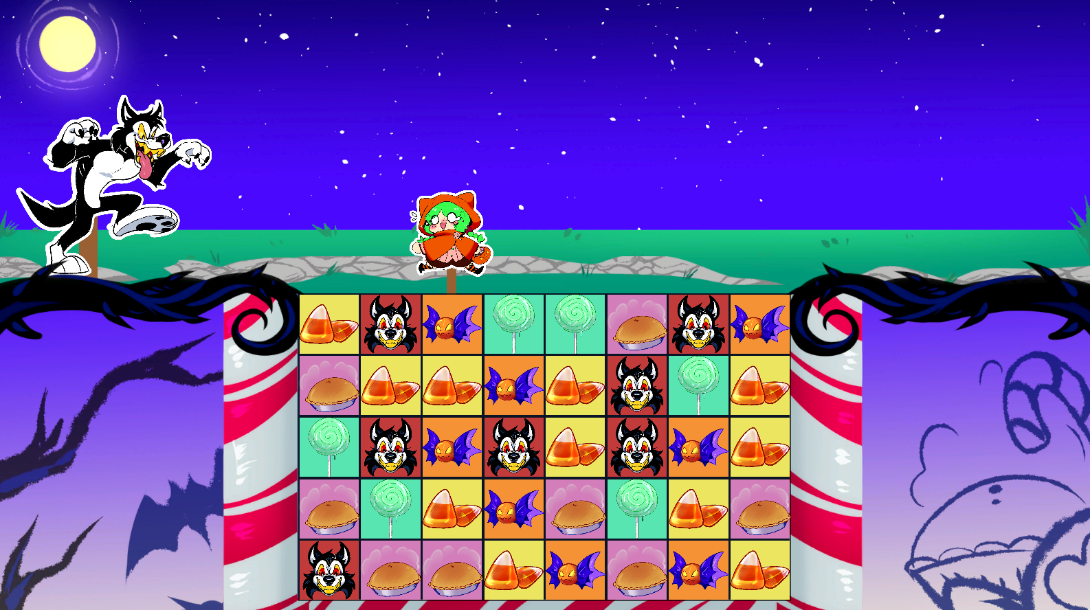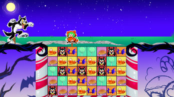 A match-3 style game where Little Orange Pumpkin Hood escapes a thematically costumed Wolf!